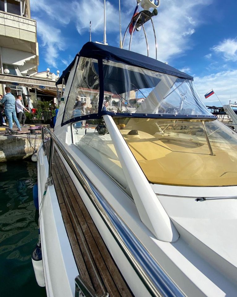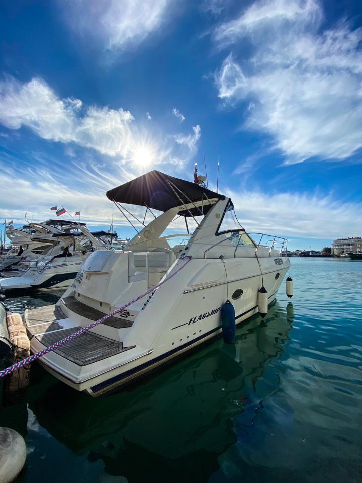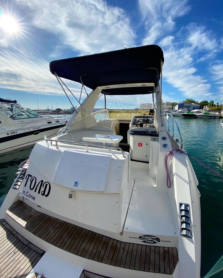 Скоростной круизный катер с белоснежным новым салоном, с тиковым (дорогой сорт дерева) покрытием носовой части и пляжника. На этой яхте вы можете получить, как острое ощущение драйва, так и тихий спокойный отдых.
