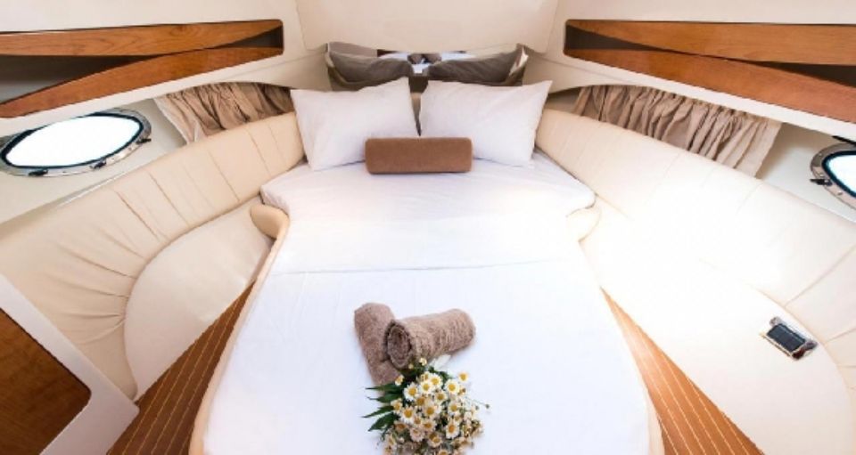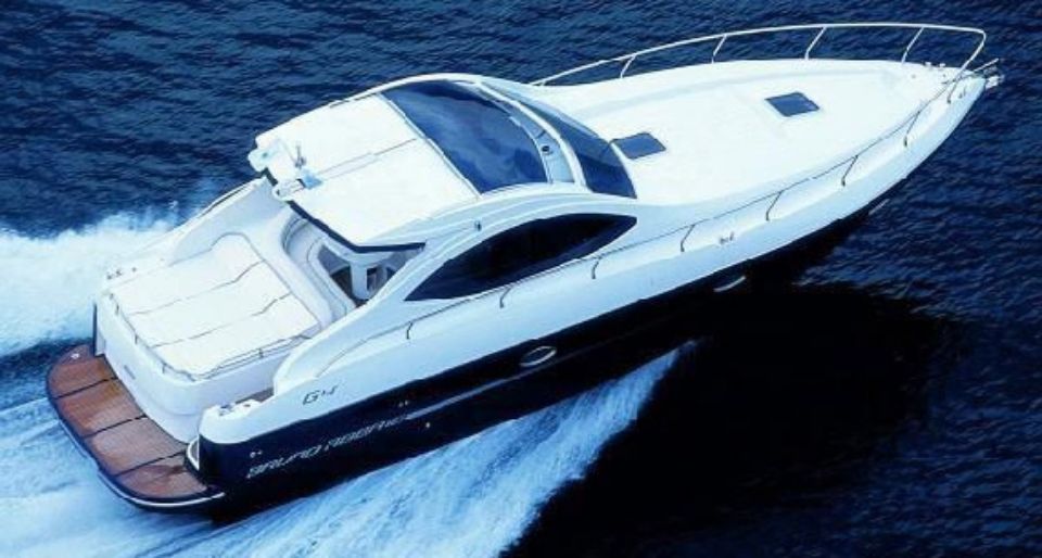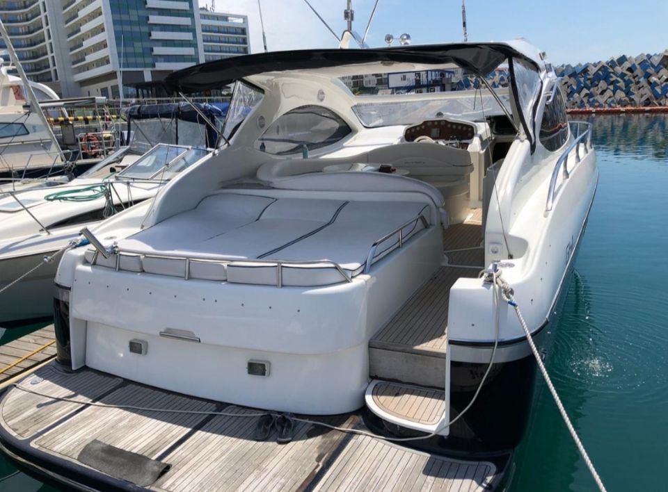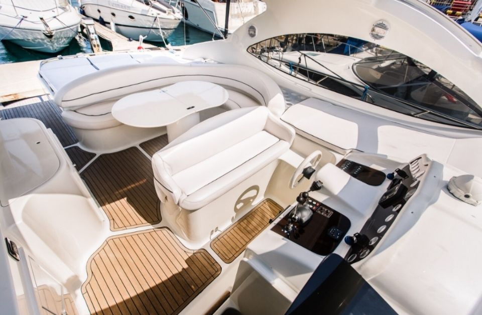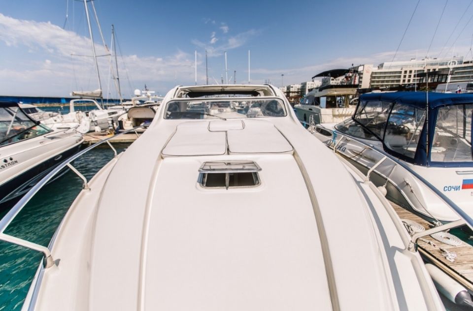 Эта яхта экскулюзивная, так как имеет необычную кормовую часть. Диваны на которых с комфортом можно расоложиться до 4 человек в полный рост.