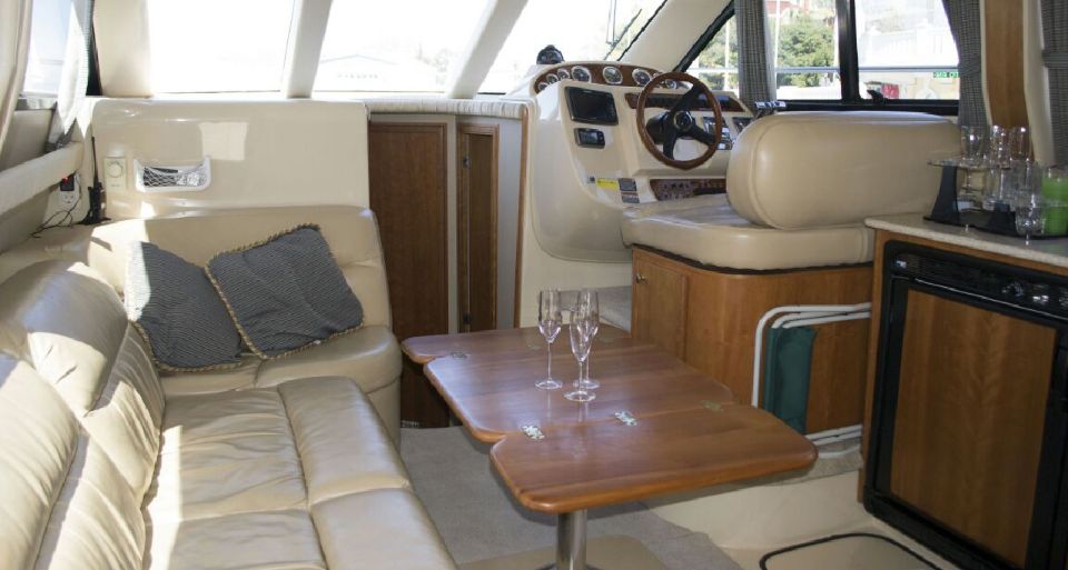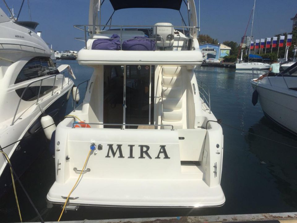 На флайбридже (втора палуба) имеется небольшой столик с мягкими подушками, а так же выдвижной стол на карме. Вместительность яхты до 11 гостей.
